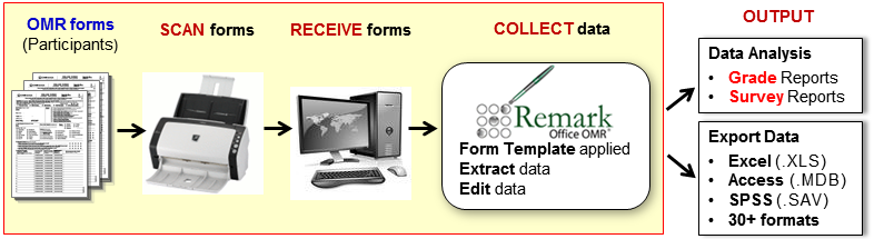 Scan FormsScan OMR forms with any image scanner or MFP to extract data from filled forms. Remark Office OMR reads OMR marks, handwritten texts (optional) printed texts as well as barcode information from your forms. Handwritten areas can be captured as image fields or via easy data entry by an operator with image-linked view. Built-in exception handling also locates and allows you to correct or verify any erroneously marked forms (i.e.- a person fills in two marks for a question, or fails to answer a question).